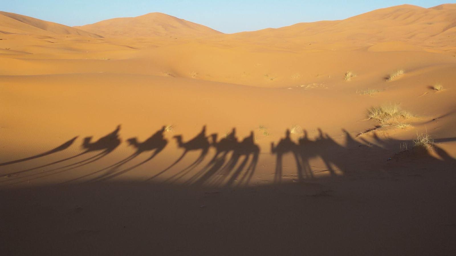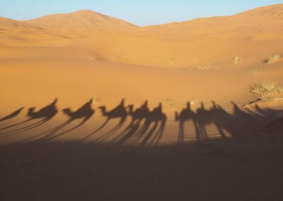 Nach einer morgendlichen Session wartet das Frühstück auf uns. Anschließend geht es los, die Wüste ruft! Mit der ruhigen Energie der Kamele schwingen wir uns schnell auf die Ruhe der Wüste ein. Wir befinden uns nun an einem der schönsten Orte der Wüste, da wo die Natur so klar und unberührt ist, dass ihre Schönheit nahezu überwältigend ist. Mittags warten bereits ein Picknick und die Familie Oussidi auf uns, die uns während unseres Trekkings in der Wüste umsorgen wird. Nachdem wir uns ein wenig ausgeruht haben, setzen wir unsere Wanderung fort. Lass die Wüste auf dich wirken und tauche in eine so umfassende tiefe Stille ein, wie du sie bislang vermutlich noch nicht kanntest.